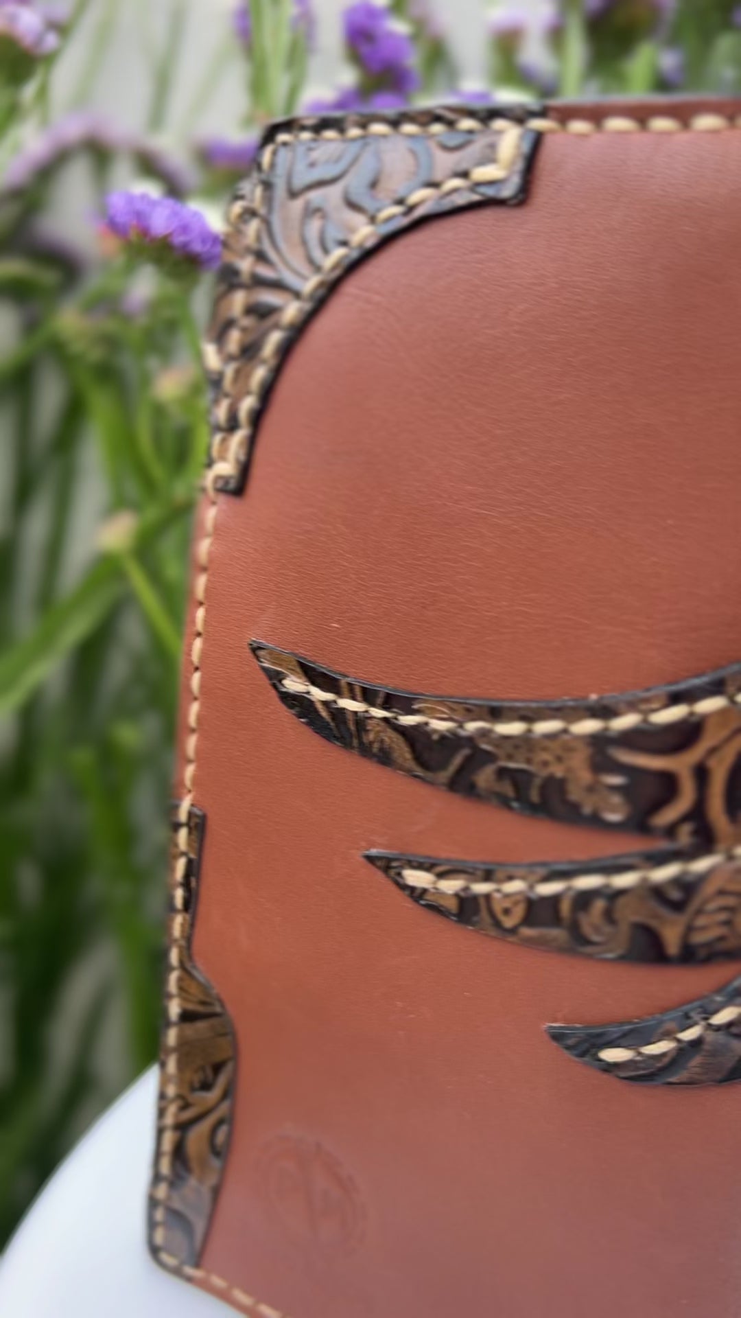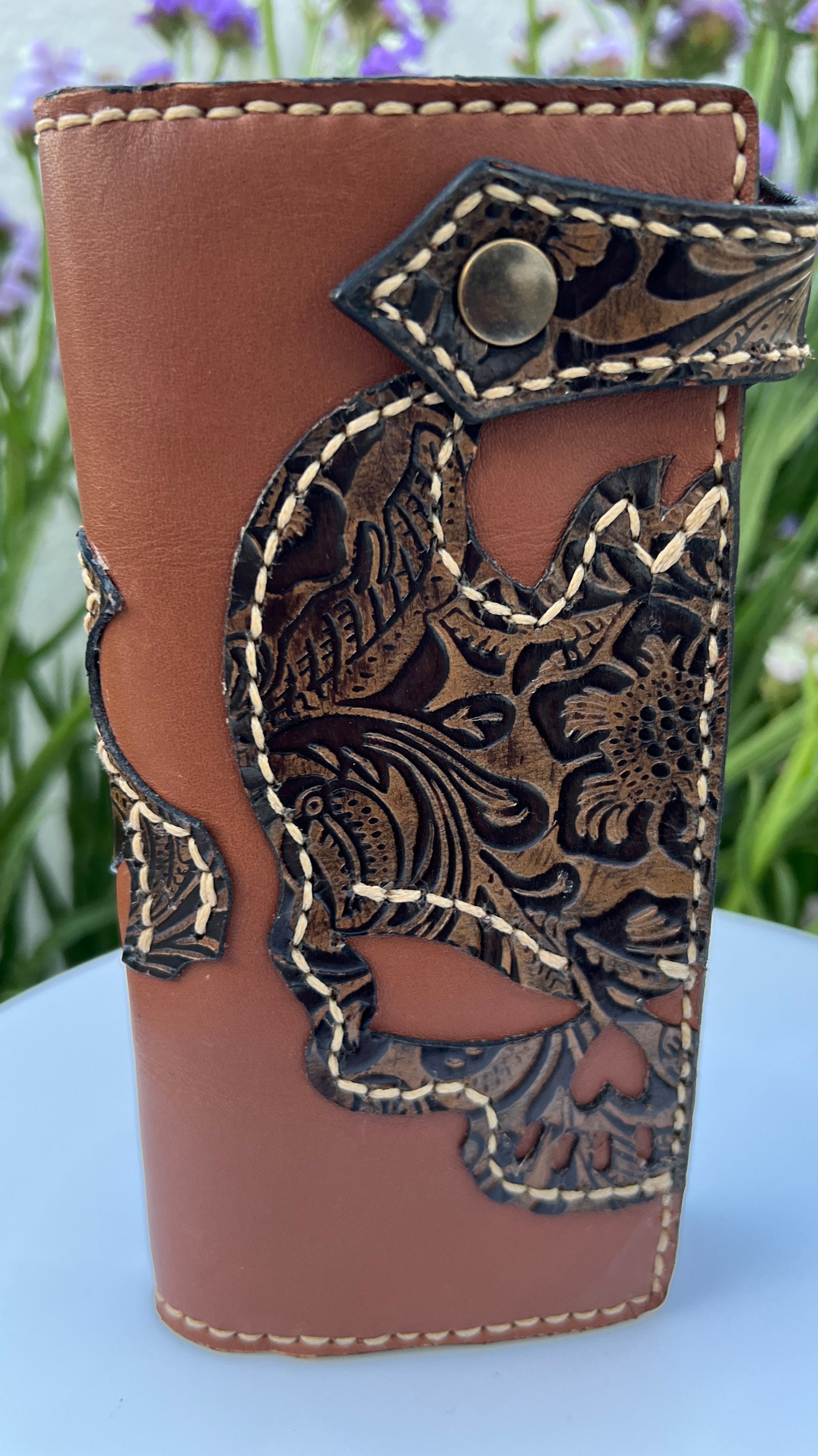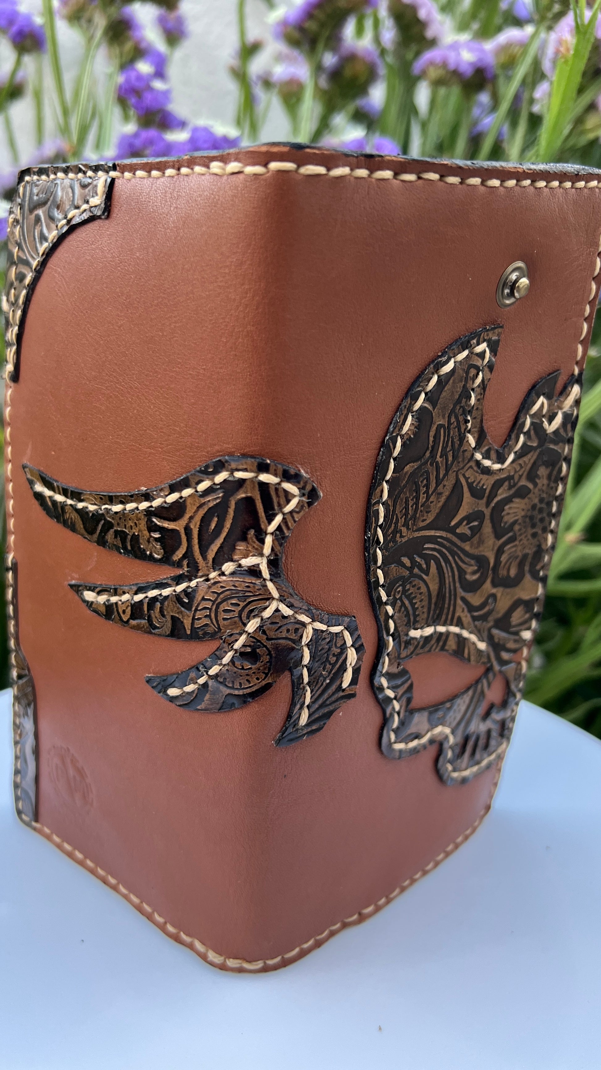 Autêntica e cheia de carácter, esta carteira artesanal em couro genuíno combina tradição e design contemporâneo. Produzida à mão com atenção a cada detalhe, apresenta um elegante contraste entre o couro castanho natural e as aplicações em relevo floral e caveira estilizada, costuradas manualmente para um acabamento distinto e duradouro.