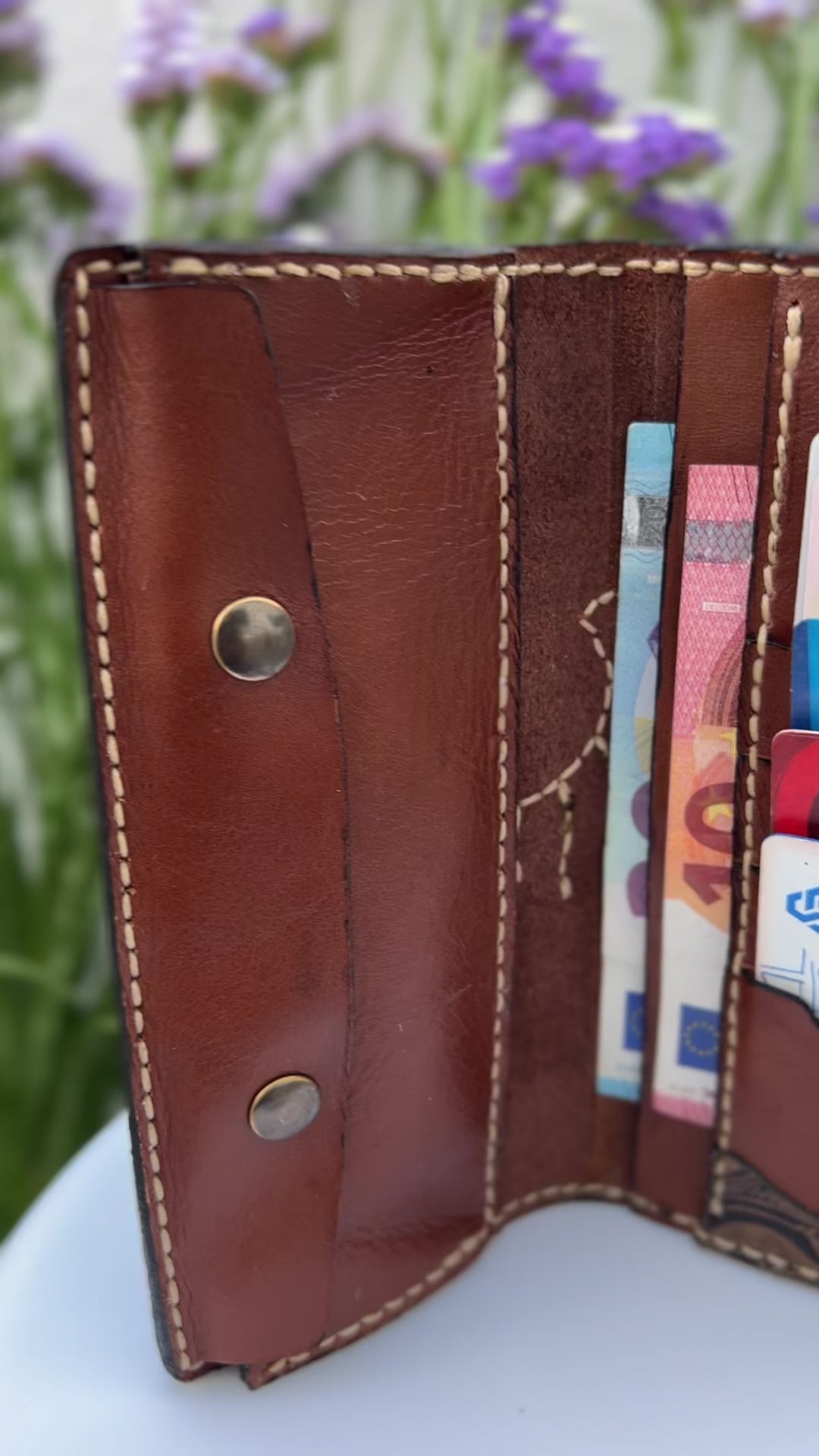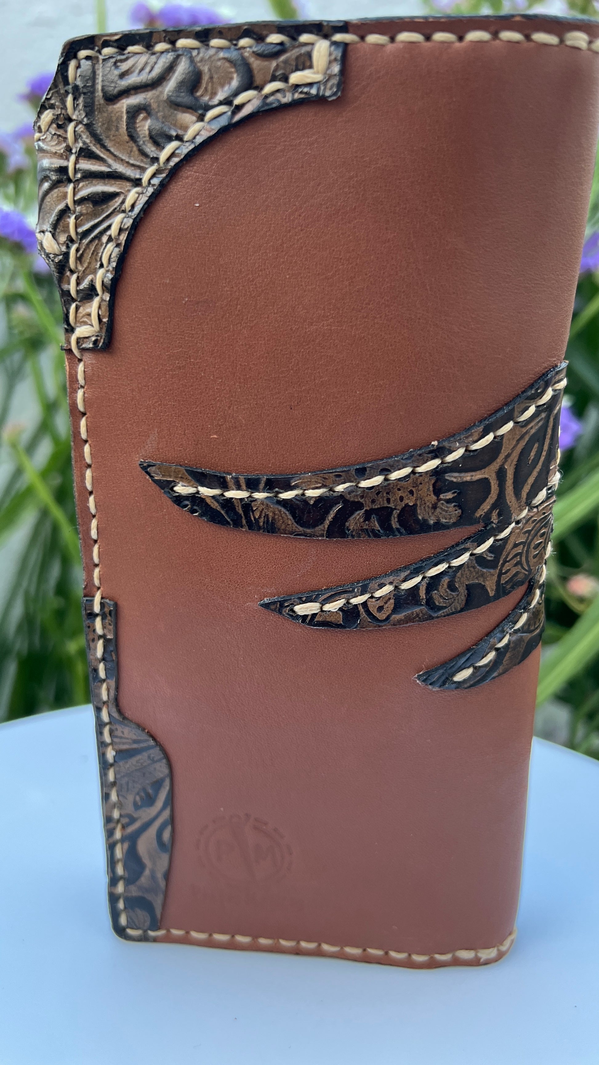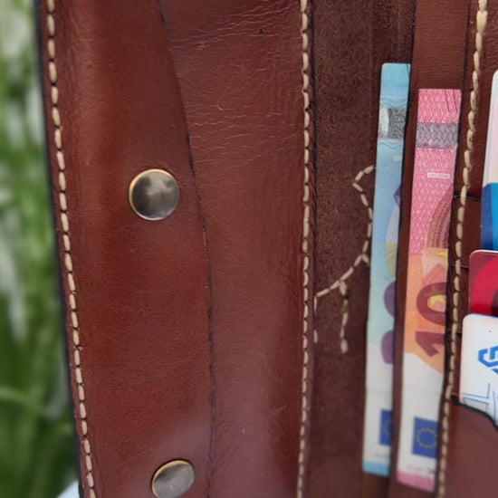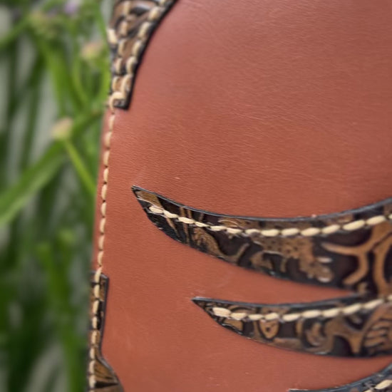 Autêntica e cheia de carácter, esta carteira artesanal em couro genuíno combina tradição e design contemporâneo. Produzida à mão com atenção a cada detalhe, apresenta um elegante contraste entre o couro castanho natural e as aplicações em relevo floral e caveira estilizada, costuradas manualmente para um acabamento distinto e duradouro.