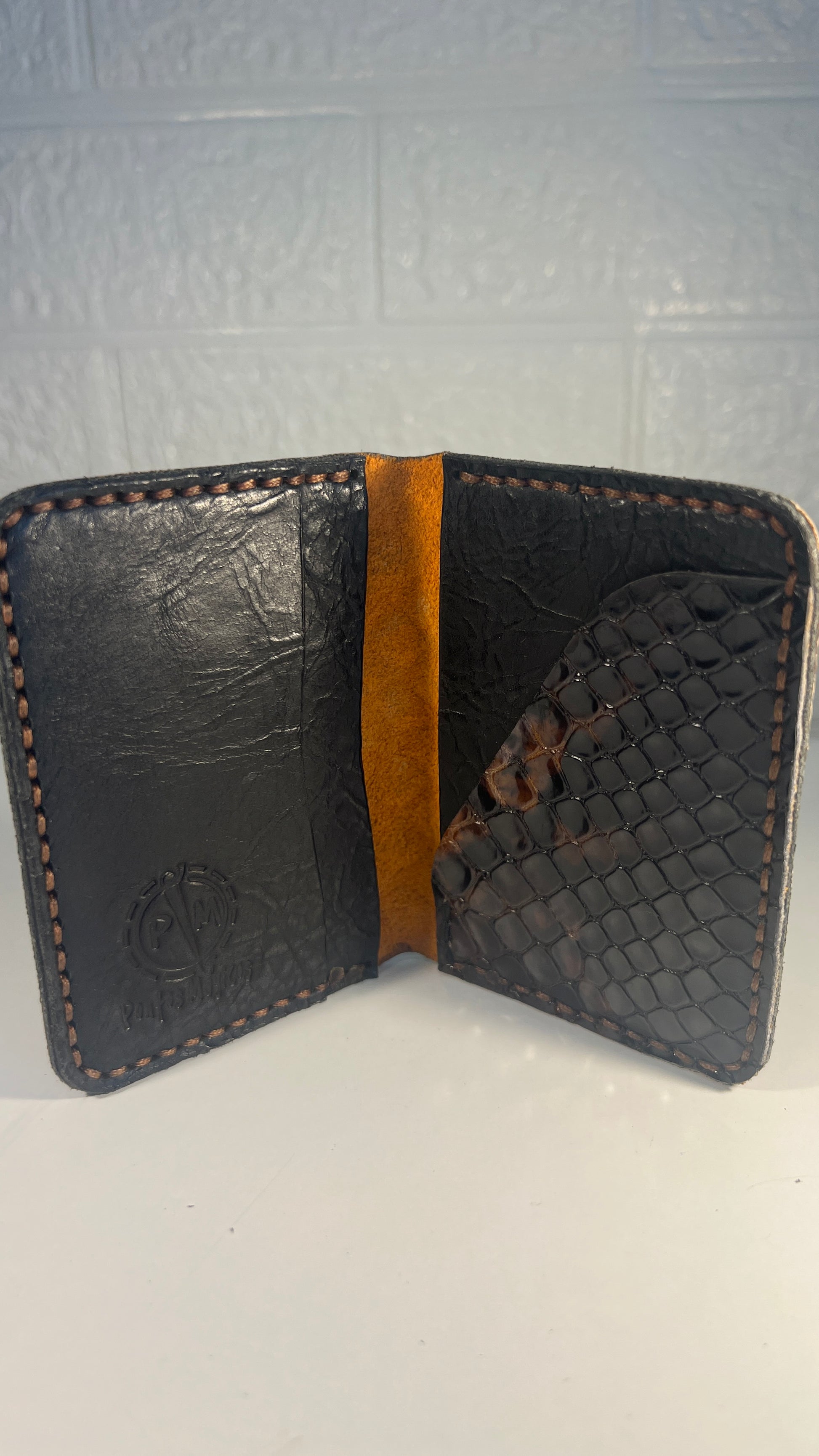 Com acabamento escamado em preto profundo e brilho elegante, este porta cartões em couro genuíno é uma peça com forte presença estética. Produzido artesanalmente em Portugal, cada exemplar é cuidadosamente cosido à mão, garantindo personalidade e robustez.