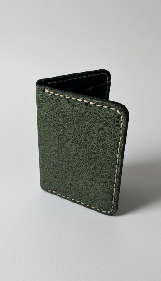 Produzido em couro genuíno verde com relevos naturais e costura manual clara, é uma peça elegante e durável que transmite autenticidade e estilo.
